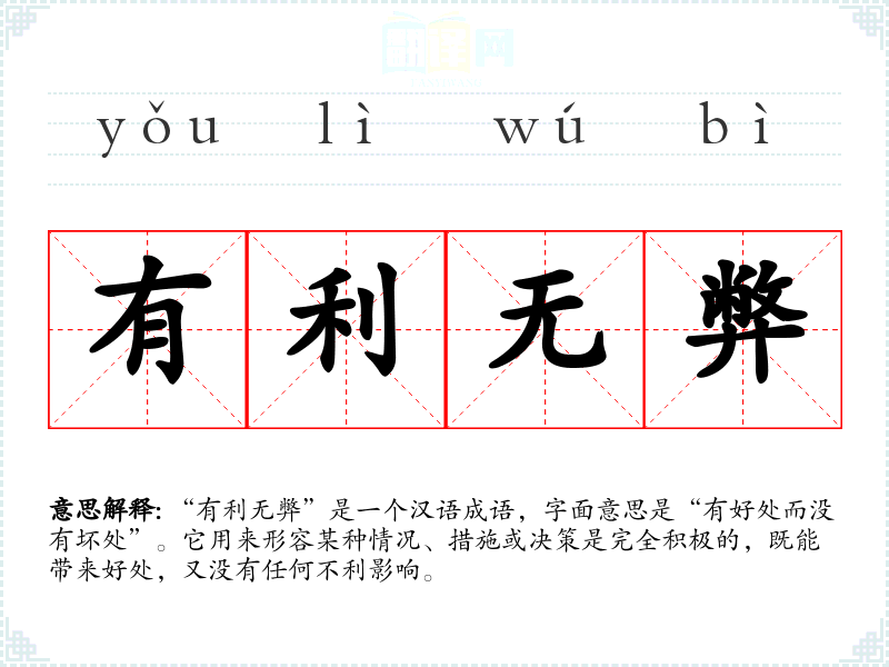 “有利无弊”是一个汉语成语,字面意思是“有好处而没有坏处”。它用来形容某种情况、措施或决策是完全积极的,既能带来好处,又没有任何不利影响。