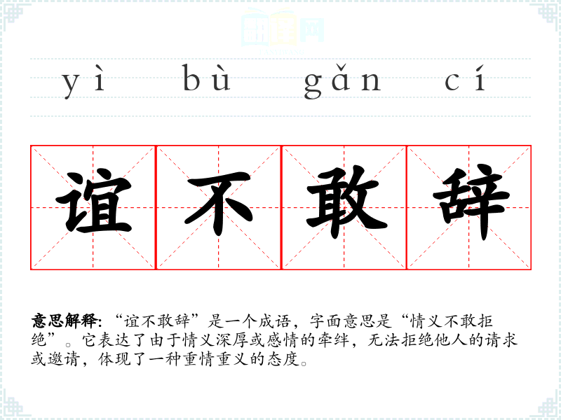 “谊不敢辞”是一个成语,字面意思是“情义不敢拒绝”。它表达了由于情义深厚或感情的牵绊,无法拒绝他人的请求或邀请,体现了一种重情重义的态度。