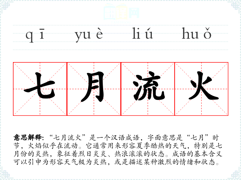 “七月流火”是一个汉语成语,字面意思是“七月”时节,火焰似乎在流动。它通常用来形容夏季酷热的天气,特别是七月份的炎热,象征着烈日炎炎、热浪滚滚的状态。成语的基本含义可以引申为形容天气极为炎热,或是描述某种激烈的情绪和状态。