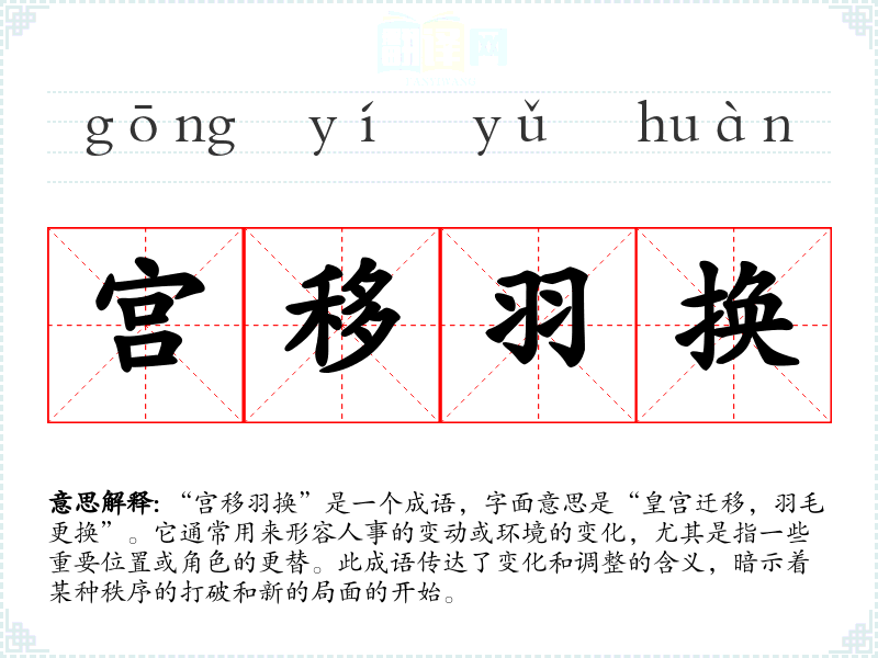 关于“宫移羽换”的具体来源,虽然在古代文献中并不常见,但它可以被视为与“变迁”相关的成语,反映了古代社会中政治和皇权更替的现象。在历史上,宫廷内外的权力斗争、皇位的继承和更替,常常伴随着重大的人事调动和环境改变。