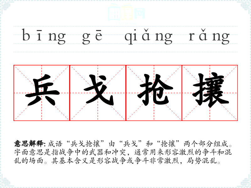 - 反义成语:和气生财、安居乐业——强调和平、安定的状态,与“兵戈抢攘”的混乱相对立。