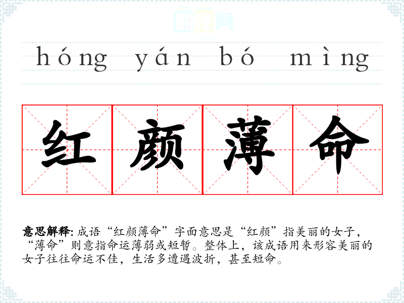 成语“红颜命”字面意思是“红颜”指美丽的女子,“命”则意指命运*弱或短暂。整体上,该成语用来形容美丽的女子往往命运不佳,生活多遭遇波折,甚至短命。