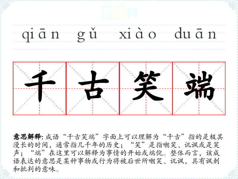 成语“千古笑端”字面上可以理解为“千古”指的是极其漫长的时间,通常指几千年的历史;“笑”是指嘲笑、讥讽或是笑声;“端”在这里可以解释为事情的开始或端倪。整体而言,该成语表达的意思是某种事物或行为将被后世所嘲笑、讥讽,具有讽刺和批判的意味。