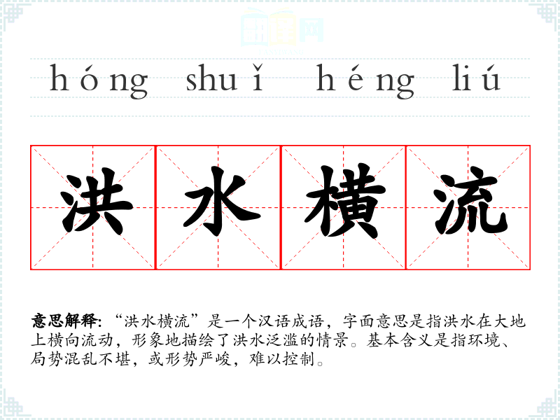 “洪水横流”是一个汉语成语,字面意思是指洪水在大地上横向流动,形象地描绘了洪水泛滥的情景。基本含义是指环境、局势混乱不堪,或形势严峻,难以控制。