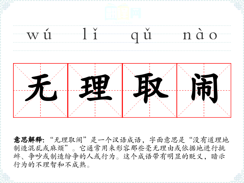 在**文化中,“无理取闹”反映了对理性和和谐的重视。在现代社会中,这个成语常用于描述一些不理智的社会行为或个人争端,尤其是在网络时代,网络暴力和无端争论的现象屡见不鲜。
