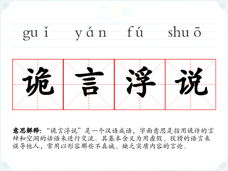“诡言浮说”是一个汉语成语,字面意思是指用诡诈的言辞和空洞的话语来进行交流。其基本含义为用虚假、狡猾的语言来误导他人,常用以形容那些不真诚、缺乏实质内容的言论。