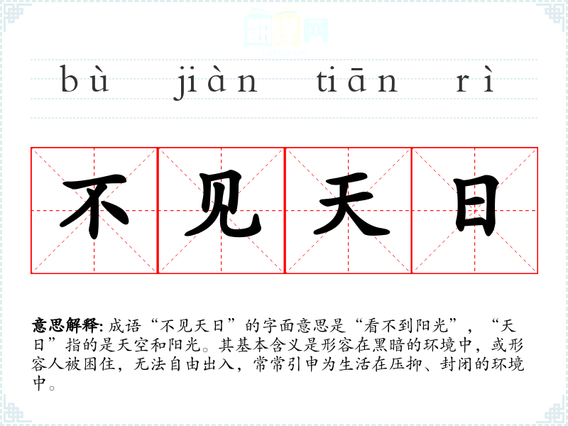 成语“不见天日”的字面意思是“看不到阳光”,“天日”指的是天空和阳光。其基本含义是形容在黑暗的环境中,或形容人被困住,无法自由出入,常常引申为生活在压抑、封闭的环境中。
