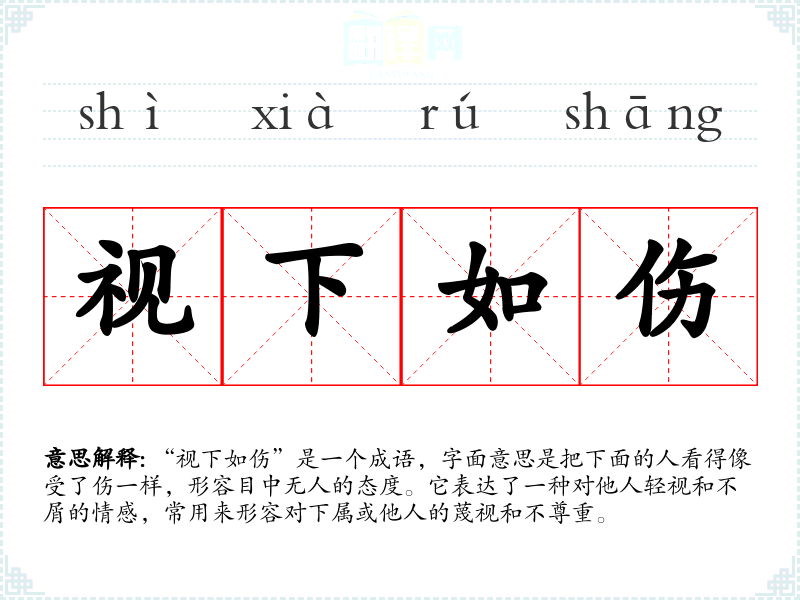 “视下如伤”是一个成语,字面意思是把下面的人看得像受了伤一样,形容目中无人的态度。它表达了一种对他人轻视和不屑的情感,常用来形容对下属或他人的蔑视和不尊重。