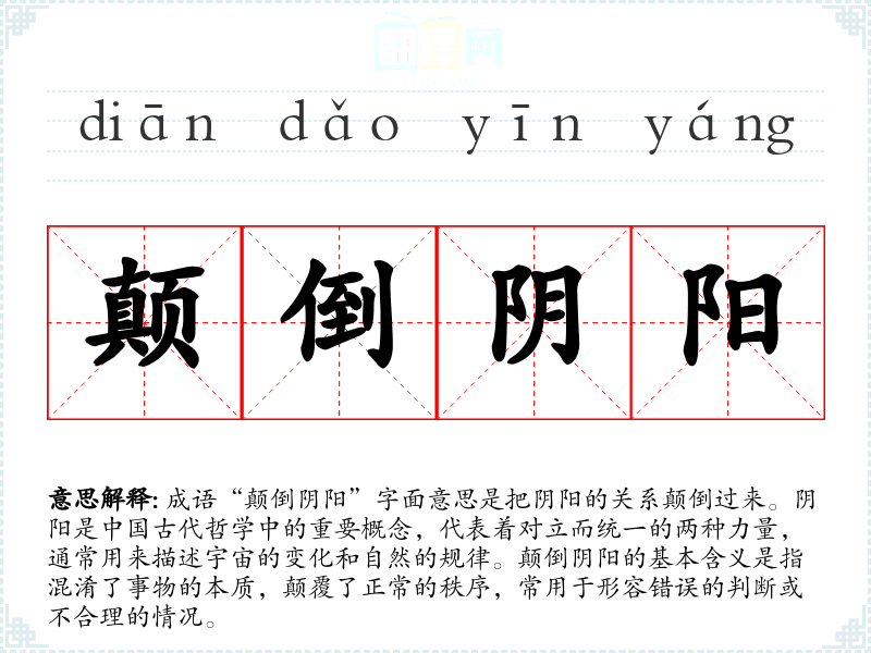 成语“颠倒阴阳”字面意思是把阴阳的关系颠倒过来。阴阳是**古代哲学中的重要概念,代表着对立而统一的两种力量,通常用来描述宇宙的变化和自然的规律。颠倒阴阳的基本含义是指混淆了事物的本质,颠覆了正常的秩序,常用于形容错误的判断或不合理的情况。