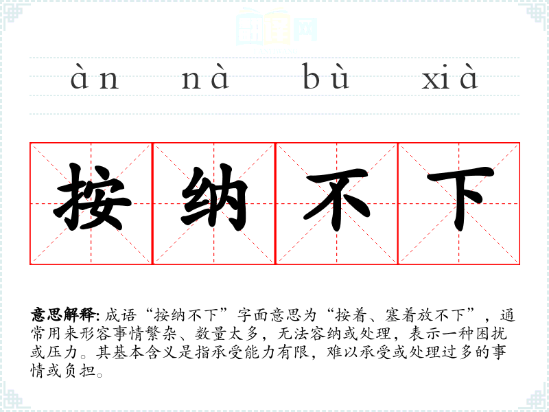 成语“按纳不下”字面意思为“按着、塞着放不下”,通常用来形容事情繁杂、数量太多,无法容纳或处理,表示一种困扰或压力。其基本含义是指承受能力有限,难以承受或处理过多的事情或负担。