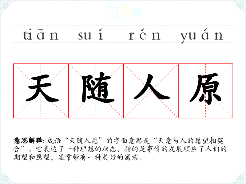 成语“天随人愿”的字面意思是“天意与人的愿望相契合”。它表达了一种理想的状态,指的是事情的发展顺应了人们的期望和愿望,通常带有一种美好的寓意。
