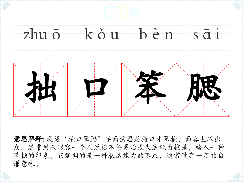成语“拙口笨腮”字面意思是指口才笨拙,面容也不出众。通常用来形容一个人说话不够灵活或表达能力较差,给人一种笨拙的印象。它强调的是一种表达能力的不足,通常带有一定的自谦意味。
