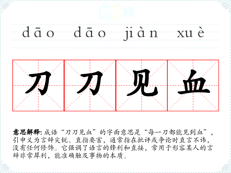 成语“刀刀见血”的字面意思是“每一刀都能见到血”,引申义为言辞尖锐、直指要害,通常指在批评或争论时直言不讳,没有任何修饰。它强调了语言的锋利和直接,常用于形容某人的言辞非常犀利,能准确触及事物的本质。