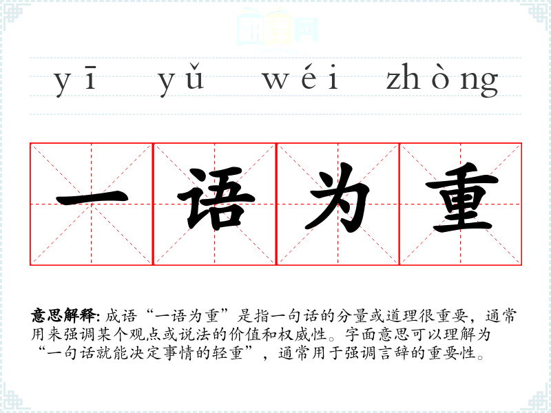 成语“一语为重”是指一句话的分量或道理很重要,通常用来强调某个观点或说法的价值和权威性。字面意思可以理解为“一句话就能决定事情的轻重”,通常用于强调言辞的重要性。
