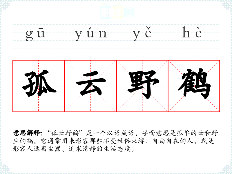 “孤云野鹤”是一个汉语成语,字面意思是孤单的云和野生的鹤。它通常用来形容那些不受世俗束缚、自由自在的人,或是形容人远离尘嚣、追求清静的生活态度。