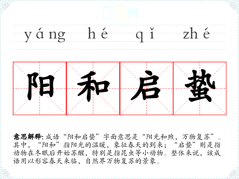 | 阳和启蛰 | 启蛰:过冬的虫豸开始活动。春天来了,过冬的虫豸都活动了。比喻恶劣的环境过去,顺利和美好的时光开始了。 |