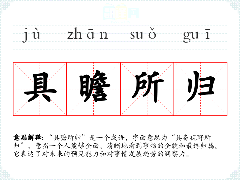 “具瞻所归”是一个成语,字面意思为“具备视野所归”,意指一个人能够全面、清晰地看到事物的全貌和最终归属。它表达了对未来的预见能力和对事情发展趋势的洞察力。