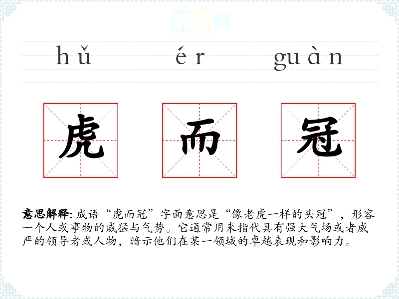 在文化中,作为一种象征,代表着权力、勇气和保护。成语“虎而冠”在现代社会中也可以用来形容那些在职场、社交场合或公众视野中展现出强大气场与影响力的人物,符合当今对领导力和个性魅力的追求。
