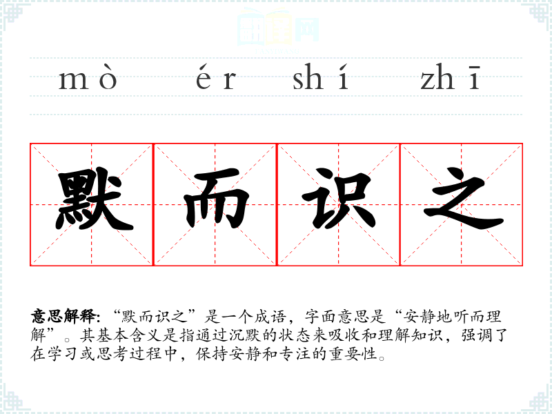 | 默而识之 | 默:不语,不说话。识:记。把所见所闻默默记在心里。 |