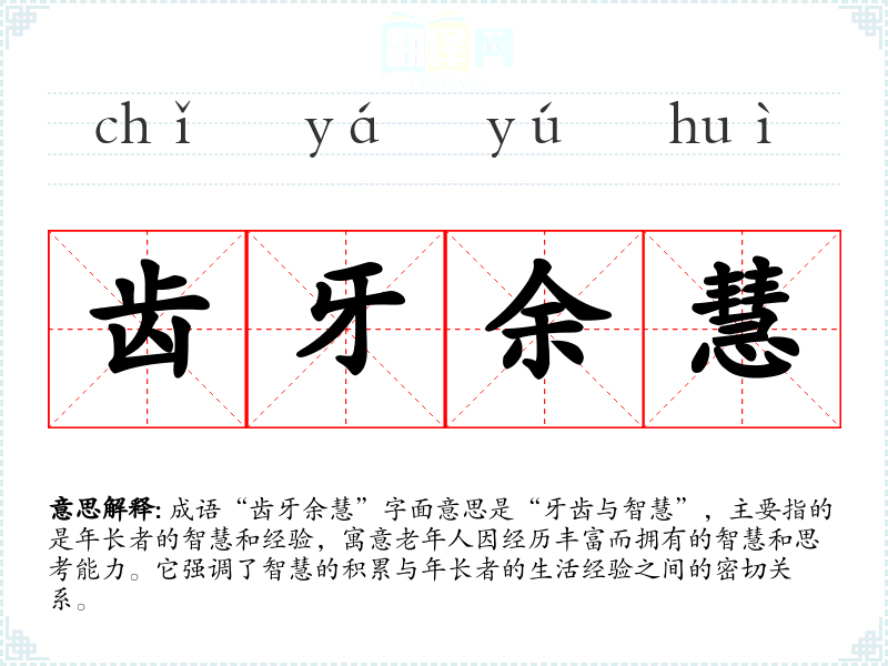 成语“齿牙余慧”字面意思是“牙齿与智慧”,主要指的是年的智慧和经验,寓意老年人因经历丰富而拥有的智慧和思考能力。它强调了智慧的积累与年的生活经验之间的密切关系。