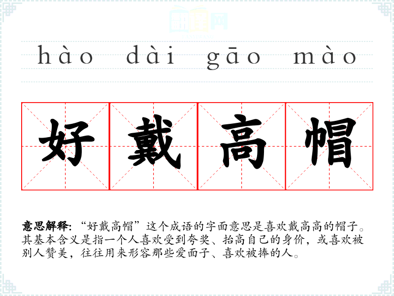 “好戴高帽”这个成语的字面意思是喜欢戴高高的帽子。其基本含义是指一个人喜欢受到夸奖、抬高自己的身价,或喜欢被别人赞美,往往用来形容那些爱面子、喜欢被捧的人。