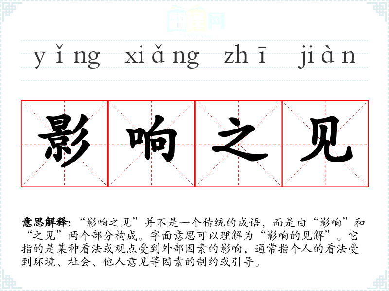“影响之见”并不是一个传统的成语,而是由“影响”和“之见”两个部分构成。字面意思可以理解为“影响的见解”。它指的是某种看法或观点受到外部因素的影响,通常指个人的看法受到环境、社会、他人意见等因素的制约或引导。