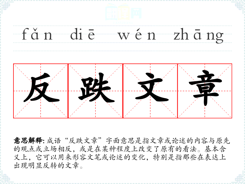 - 反义成语:一以贯之、始终如一。与“反跌文章”形成对比,表示观点或态度的一致性。