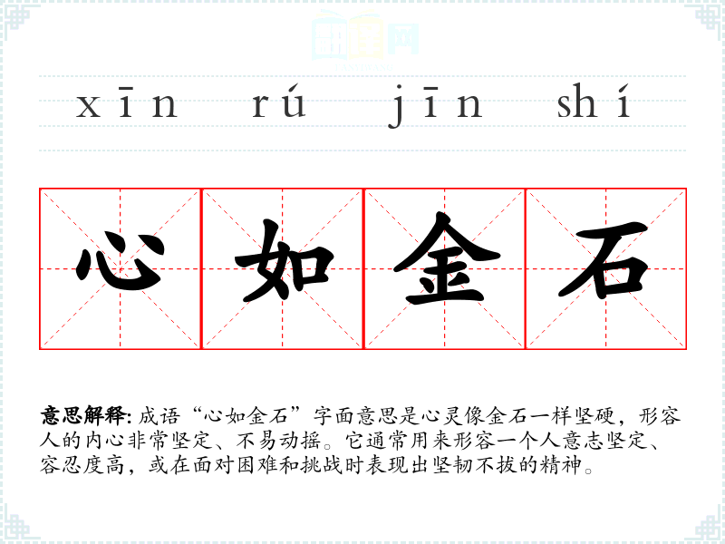 成语“心如金石”字面意思是心灵像金石一样坚硬,形容人的内心非常坚定、不易动摇。它通常用来形容一个人意志坚定、容忍度高,或在面对困难和挑战时表现出坚韧不拔的精神。