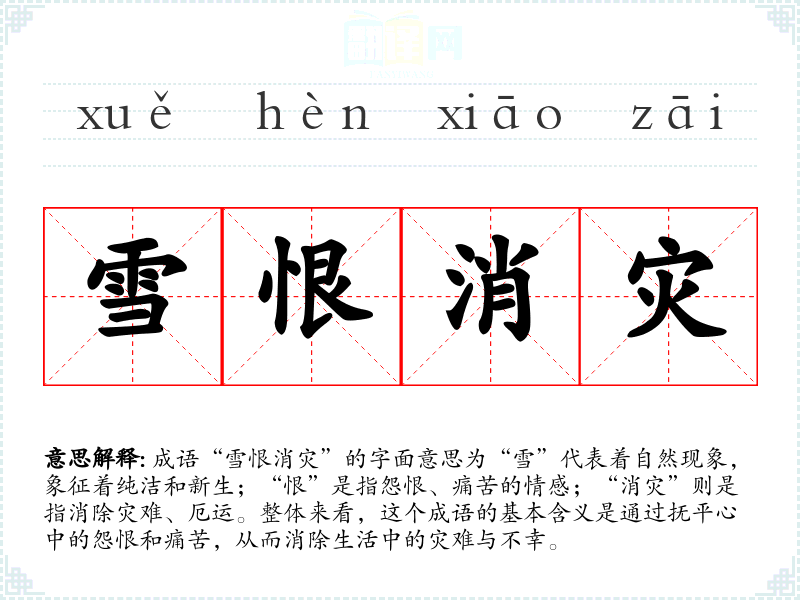 成语“雪恨消灾”的字面意思为“雪”代表着自然现象,象征着纯洁和新生;“恨”是指怨恨、痛苦的情感;“消灾”则是指消除灾难、厄运。整体来看,这个成语的基本含义是通过抚平心中的怨恨和痛苦,从而消除生活中的灾难与不幸。