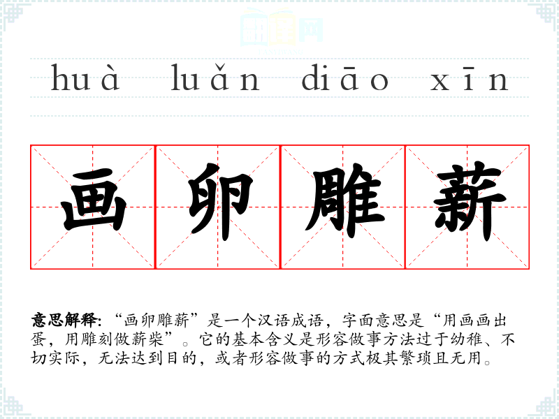 “画卵雕薪”是一个汉语成语,字面意思是“用画画出蛋,用雕刻做薪柴”。它的基本含义是形容做事方法过于幼稚、不切实际,无法达到目的,或者形容做事的方式极其繁琐且无用。