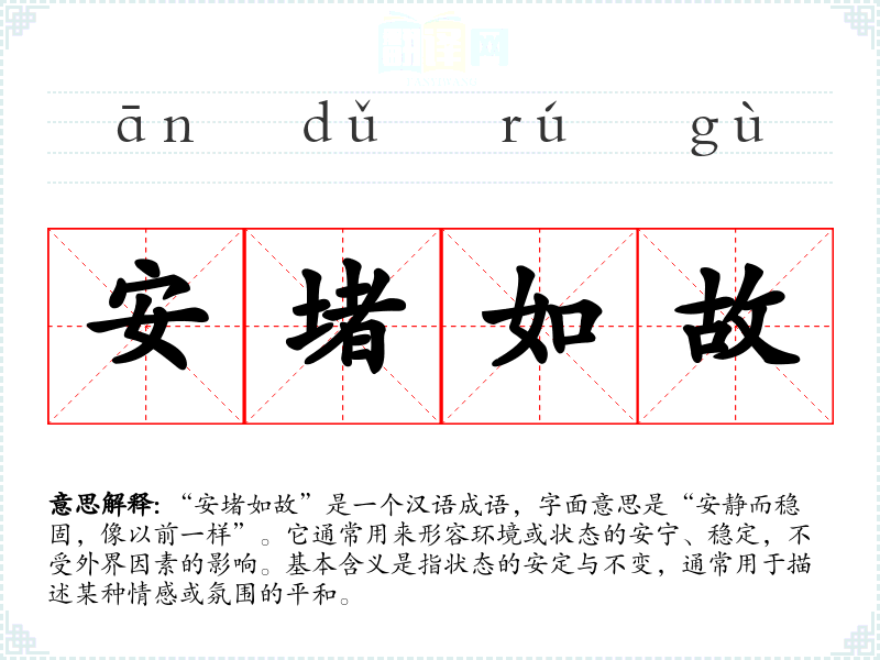 “安堵如故”是一个汉语成语,字面意思是“安静而稳固,像以前一样”。它通常用来形容环境或状态的安宁、稳定,不受外界因素的影响。基本含义是指状态的安定与不变,通常用于描述某种情感或氛围的平和。