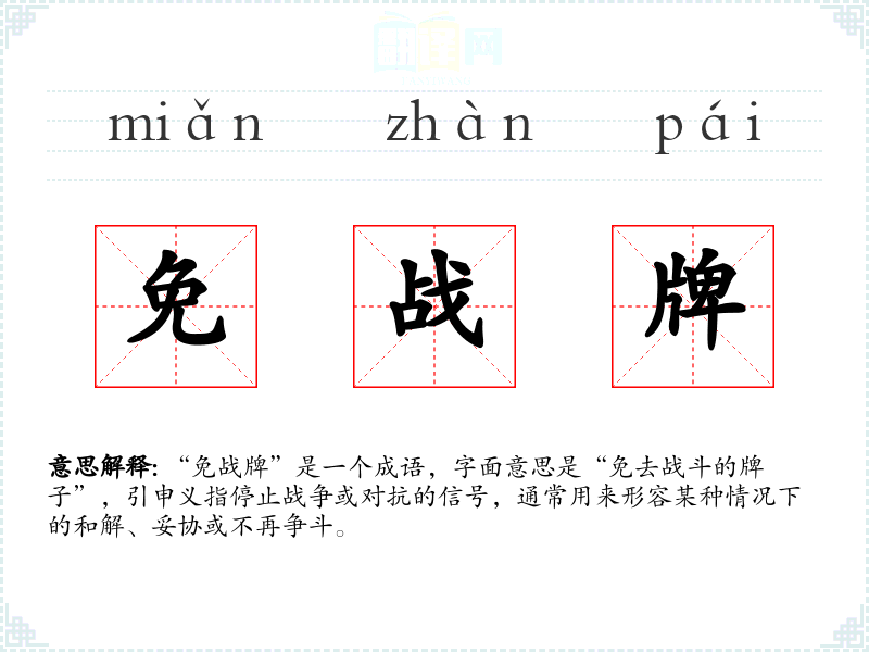 “免战牌”是一个成语,字面意思是“免去战斗的牌子”,引申义指停止战争或对抗的信号,通常用来形容某种情况下的和解、妥协或不再争斗。