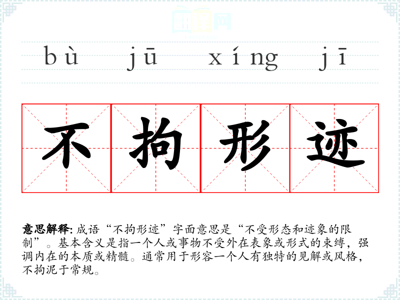 成语“不拘形迹”字面意思是“不受形态和迹象的限制”。基本含义是指一个人或事物不受外在表象或形式的束缚,强调内在的本质或精髓。通常用于形容一个人有独特的见解或风格,不拘泥于常规。