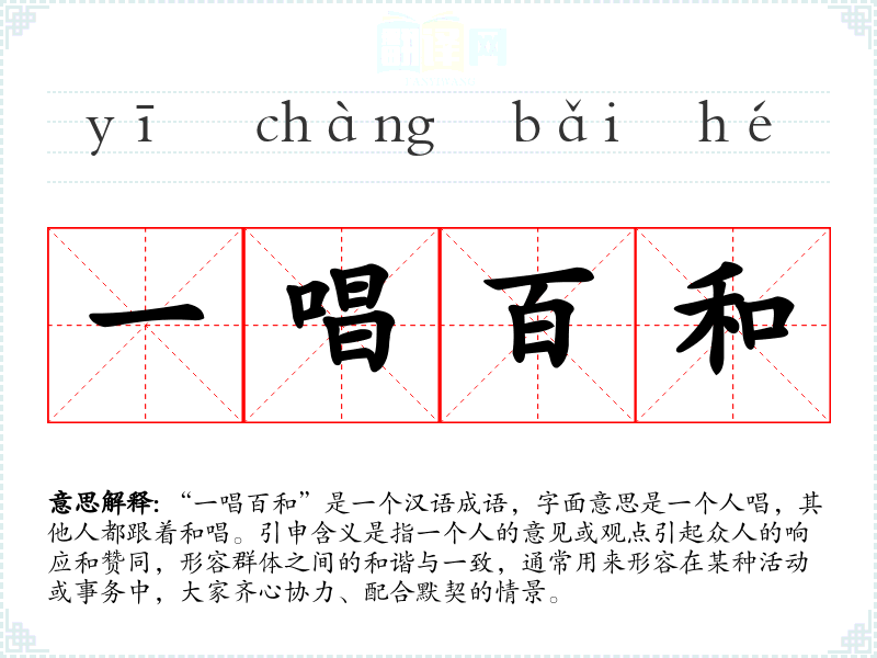 “一唱百和”是一个汉语成语,字面意思是一个人唱,其他人都跟着和唱。引申含义是指一个人的意见或观点引起众人的响应和赞同,形容群体之间的和谐与一致,通常用来形容在某种活动或事务中,大家齐心协力、配合默契的情景。