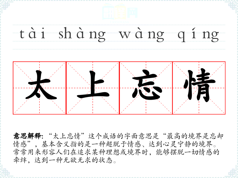 - 文学作品:在古代文学中,常用于描写隐士或哲人的超然状态。例如,在一些古典诗词中,诗人表达对自然与心境的追求,常会提到“太上忘情”。