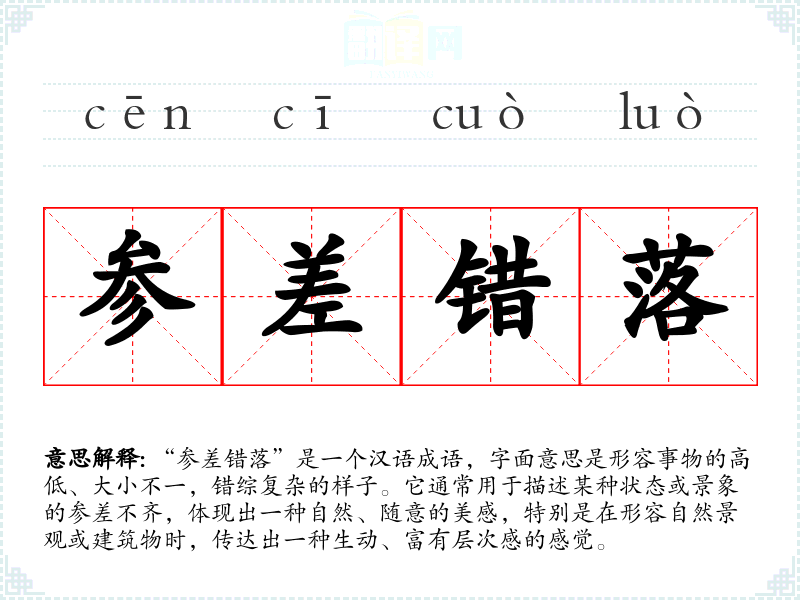 | 参差错落 | 参差:长短、高低、大小不一致。错落:交错、交织的样子。各种不同的事物,错综复杂地交织在一起。 |