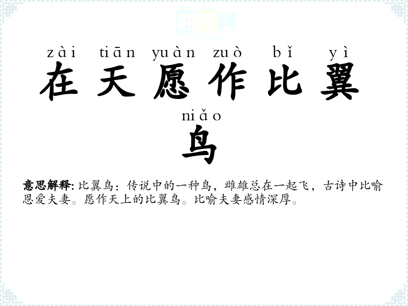 比翼鸟:传说中的一种鸟,雌雄总在一起飞,古诗中比喻恩爱夫妻。愿作天上的比翼鸟。比喻夫妻感情深厚。 |