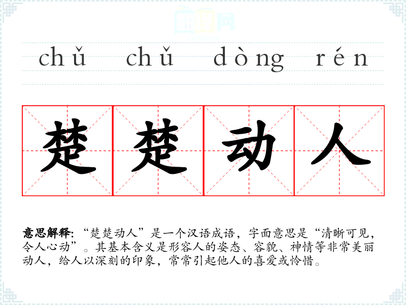 “楚楚动人”是一个汉语成语,字面意思是“清晰可见,令人心动”。其基本含义是形容人的姿态、容貌、神情等非常美丽动人,给人以深刻的印象,常常引起他人的喜爱或怜惜。