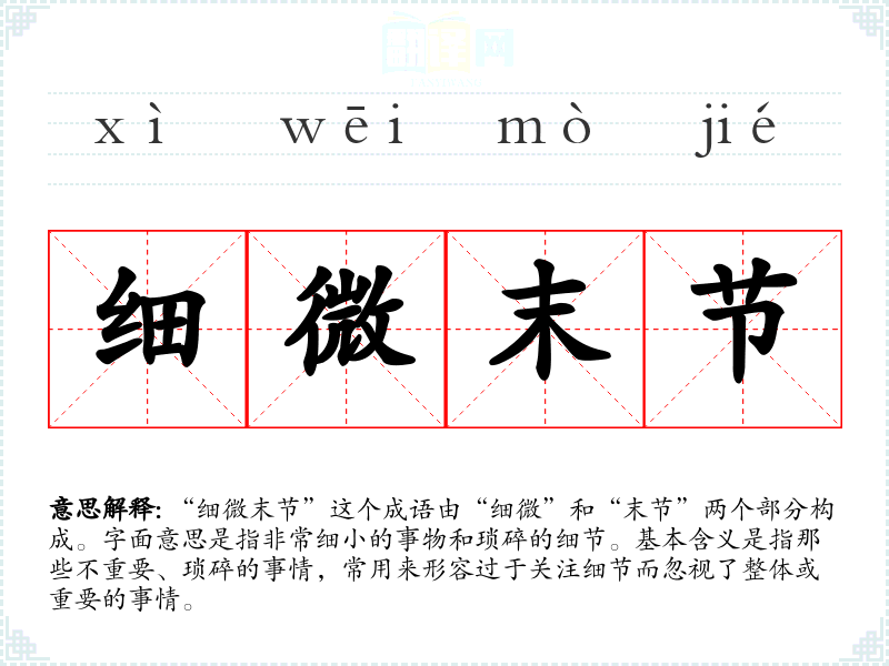 “细微末节”这个成语由“细微”和“末节”两个部分构成。字面意思是指非常细小的事物和琐碎的细节。基本含义是指那些不重要、琐碎的事情,常用来形容过于关注细节而忽视了整体或重要的事情。