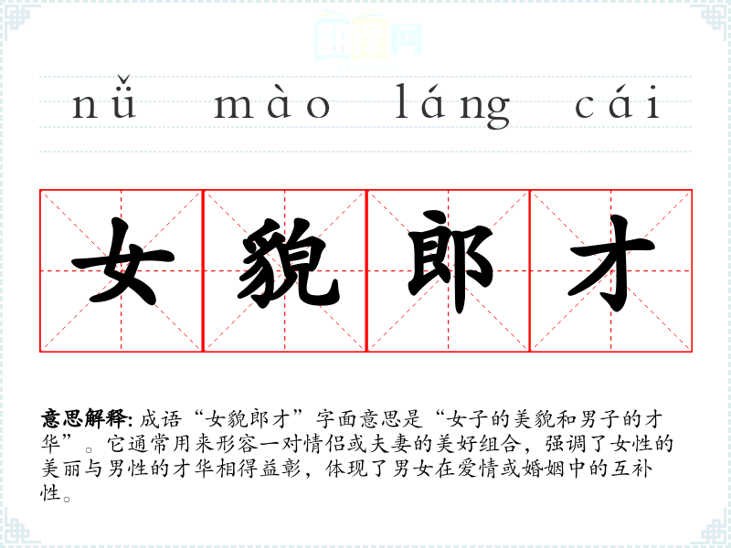成语“女貌郎才”字面意思是“女子的美貌和男子的才华”。它通常用来形容一对情侣或夫妻的美好组合,强调了女性的美丽与男性的才华相得益彰,体现了男女在爱情或婚姻中的互补性。