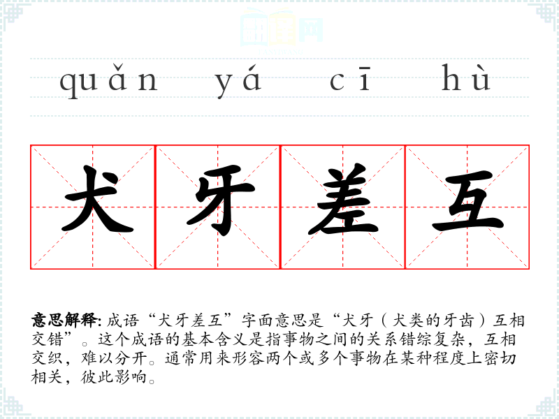 成语“犬牙差互”字面意思是“犬牙(犬类的牙齿)互相交错”。这个成语的基本含义是指事物之间的关系错综复杂,互相交织,难以分开。通常用来形容两个或多个事物在某种程度上密切相关,彼此影响。