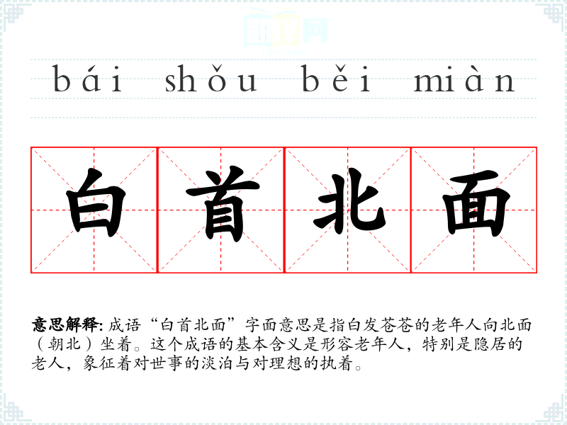 成语“白首北面”字面意思是指白发苍苍的老年人向北面(朝北)坐着。这个成语的基本含义是形容老年人,特别是隐居的老人,象征着对世事的淡泊与对理想的执着。