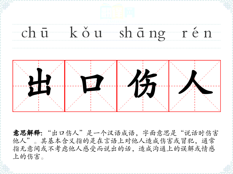 “出口伤人”是一个汉语成语,字面意思是“说话时伤害他人”。其基本含义指的是在言语上对他人造成伤害或冒犯,通常指无意间或不考虑他人感受而说出的话,造成沟通上的误解或情感上的伤害。