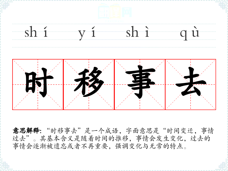 “时移事去”是一个成语,字面意思是“时间变迁,事情过去”。其基本含义是随着时间的推移,事情会发生变化,过去的事情会逐渐被遗忘或者不再重要,强调变化与无常的特点。
