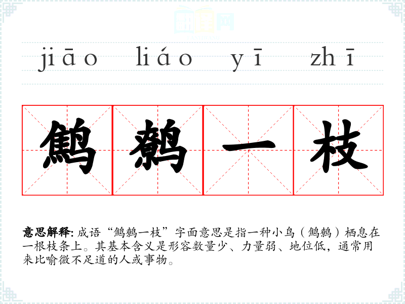成语“鹪鹩一枝”字面意思是指一种**(鹪鹩)栖息在一根枝条上。其基本含义是形容数量少、力量弱、地位低,通常用来比喻微不足道的人或事物。
