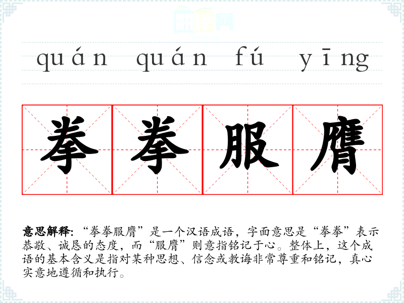 “拳拳服膺”是一个汉语成语,字面意思是“拳拳”表示恭敬、诚恳的态度,而“服膺”则意指铭记于心。整体上,这个成语的基本含义是指对某种思想、信念或教诲非常尊重和铭记,真心实意地遵循和执行。
