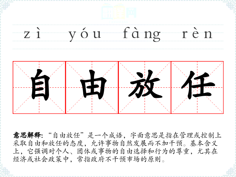 “自由放任”是一个成语,字面意思是指在管理或控制上采取自由和放任的态度,允许事物自然发展而不加干预。基本含义上,它强调对个人、团体或事物的自由选择和行为的尊重,尤其在经济或社会政策中,常指政府不干预市场的原则。
