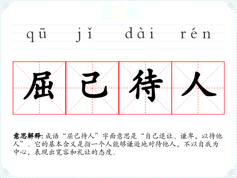 | 屈己待人 | 委屈自己,以礼待人。形容谦虚、忍让的好品行。 |