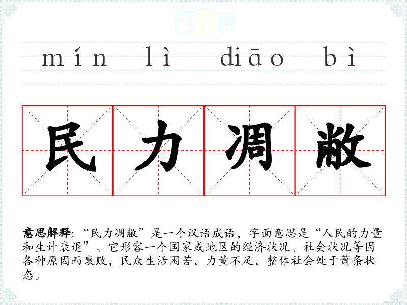 “民力凋敝”是一个汉语成语,字面意思是“人民的力量和生计衰退”。它形容一个国家或地区的经济状况、社会状况等因各种原因而衰败,民众生活困苦,力量不足,整体社会处于萧条状态。