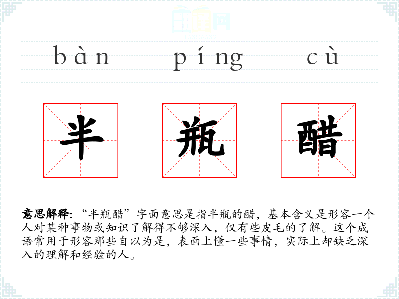 “半瓶醋”字面意思是指半瓶的醋,基本含义是形容一个人对某种事物或知识了解得不够深入,仅有些皮毛的了解。这个成语常用于形容那些自以为是,表面上懂一些事情,实际上却缺乏深入的理解和经验的人。